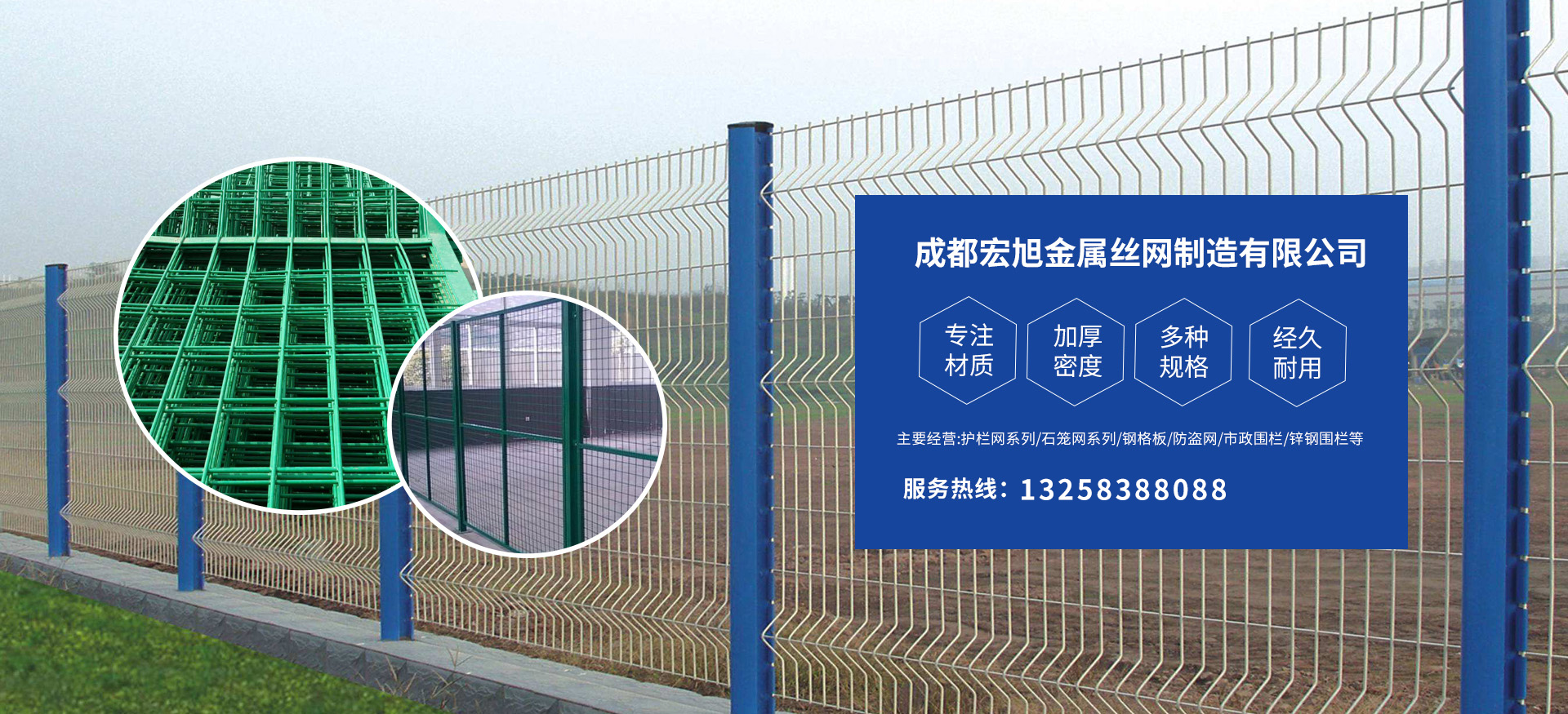 成都宏旭金屬絲網(wǎng)制造有限公司主營護(hù)欄網(wǎng)系列、石籠網(wǎng)系列、鋼格板、防盜網(wǎng)、市政圍欄、鋅鋼圍欄、鋼筋網(wǎng)片、聲屏障系列、波形護(hù)欄板、柔性纜索護(hù)欄、SNS邊坡防護(hù)網(wǎng)等其他絲網(wǎng)類產(chǎn)品。特殊規(guī)格可加工定做,也可根據(jù)客戶來圖來樣定做。自創(chuàng)業(yè)以來,公司一直堅(jiān)持市場為導(dǎo)向,以客戶為根本,以實(shí)業(yè)為基礎(chǔ),以技術(shù)為支持,以科研為后盾,集科研、生產(chǎn)、經(jīng)營為一體,不斷研制開發(fā)新產(chǎn)品,開拓市場,走綜合發(fā)展之路。多年來,公司憑借過硬的質(zhì)量,良好的信譽(yù)、優(yōu)質(zhì)的服務(wù)、合理的價格,贏得了市場和商家的一致好評。